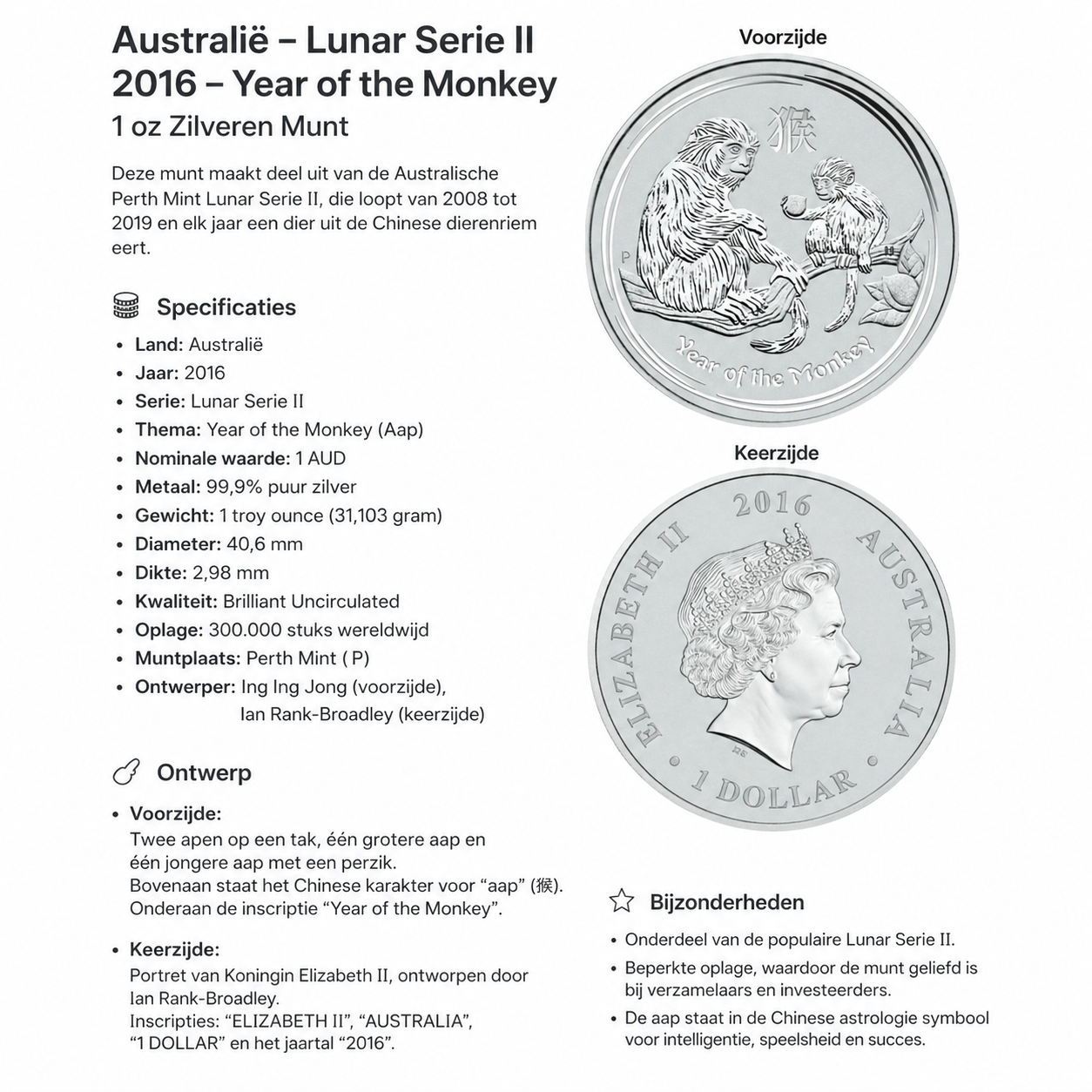 Dit is een zilveren munt uit de zogeheten Lunar-serie, gebaseerd op de Chinese dierenriem. Concreet gaat het hier om de “Year of the Monkey”